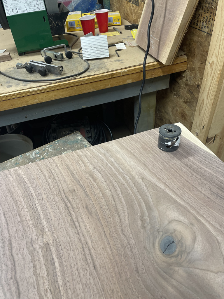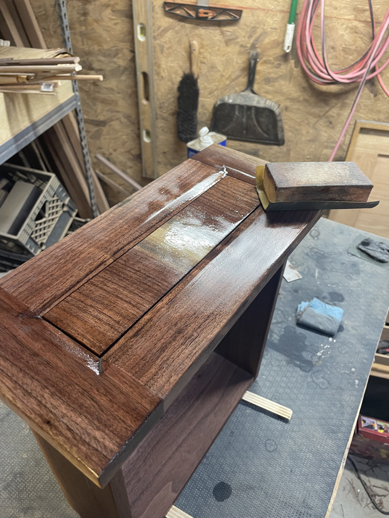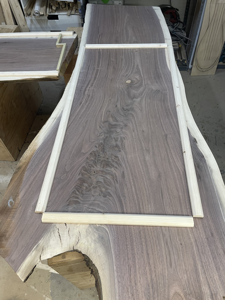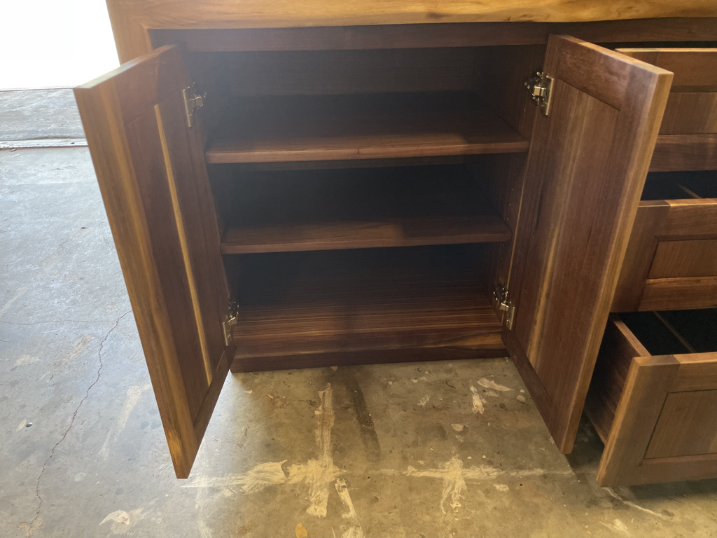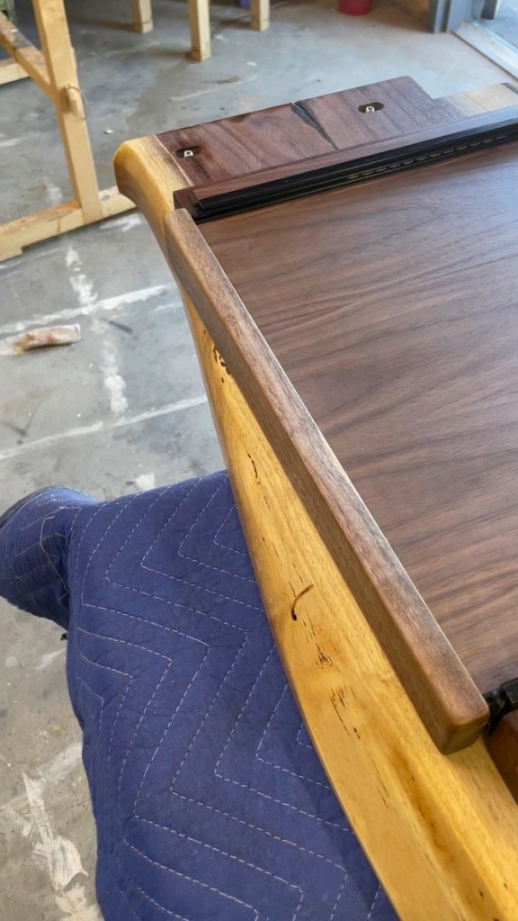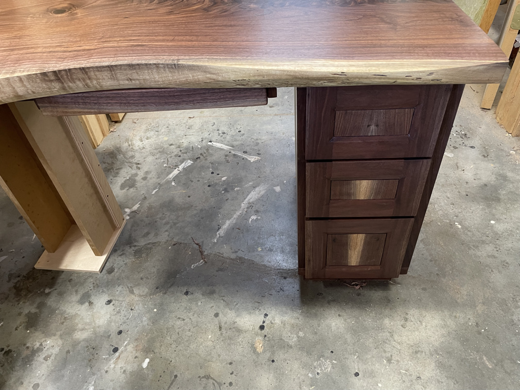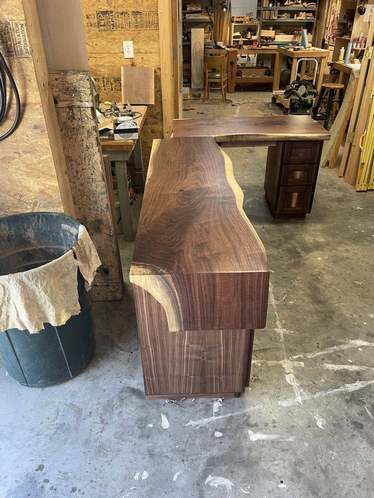 Navigating the unique challenges presented by the walnut slab, I decided to incorporate a waterfall edge on the open side of the desk. This solution effectively hid certain voids and inclusions in the wood while adding a striking visual element. During installation, we discovered that the two sliding trays didn’t leave enough room for his chair. I quickly redesigned one tray and made the necessary adjustment, ensuring that the desk met all of Larry’s needs and fit perfectly into his space.