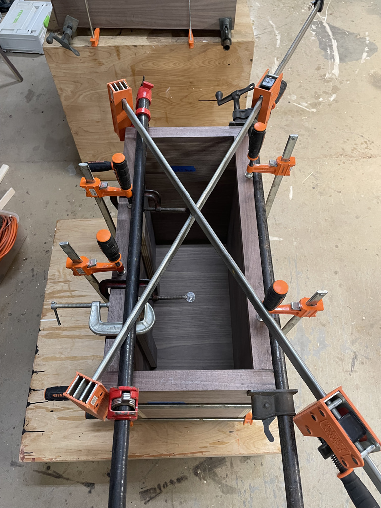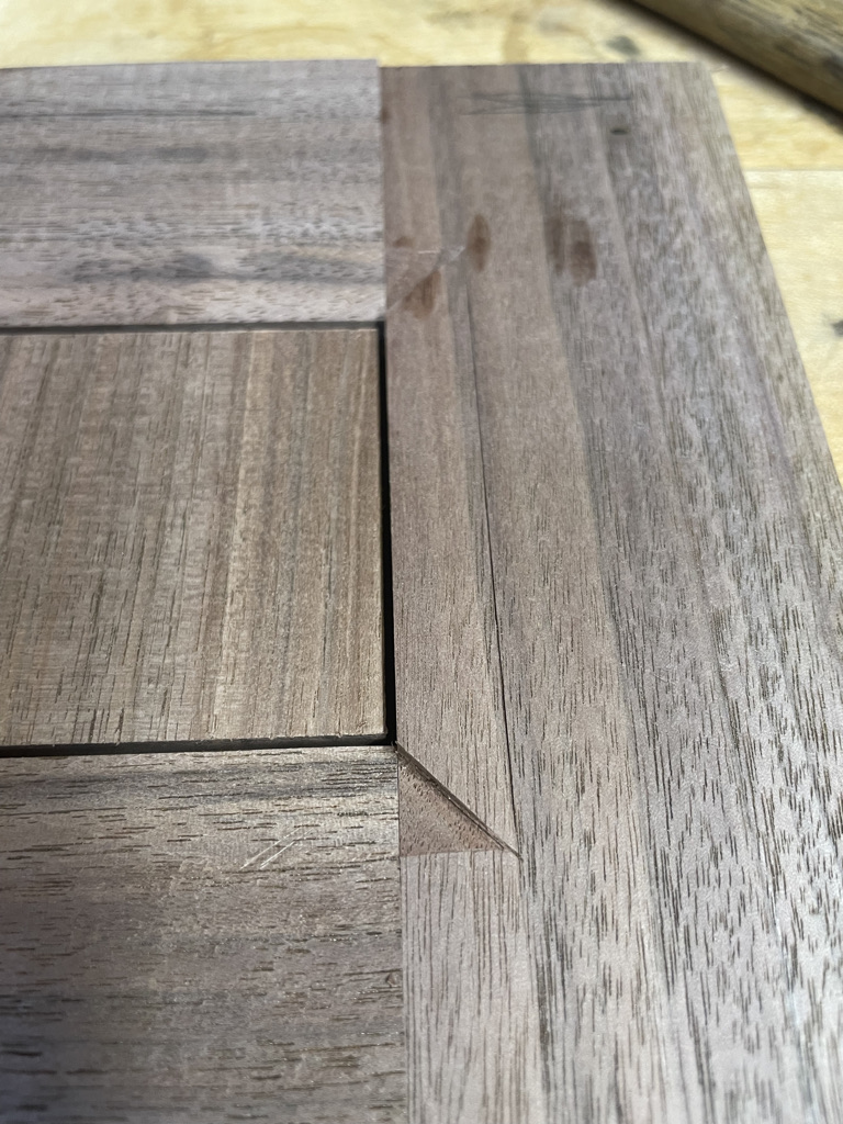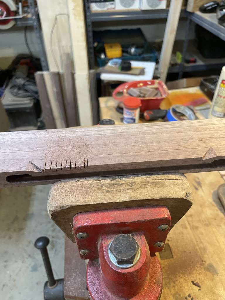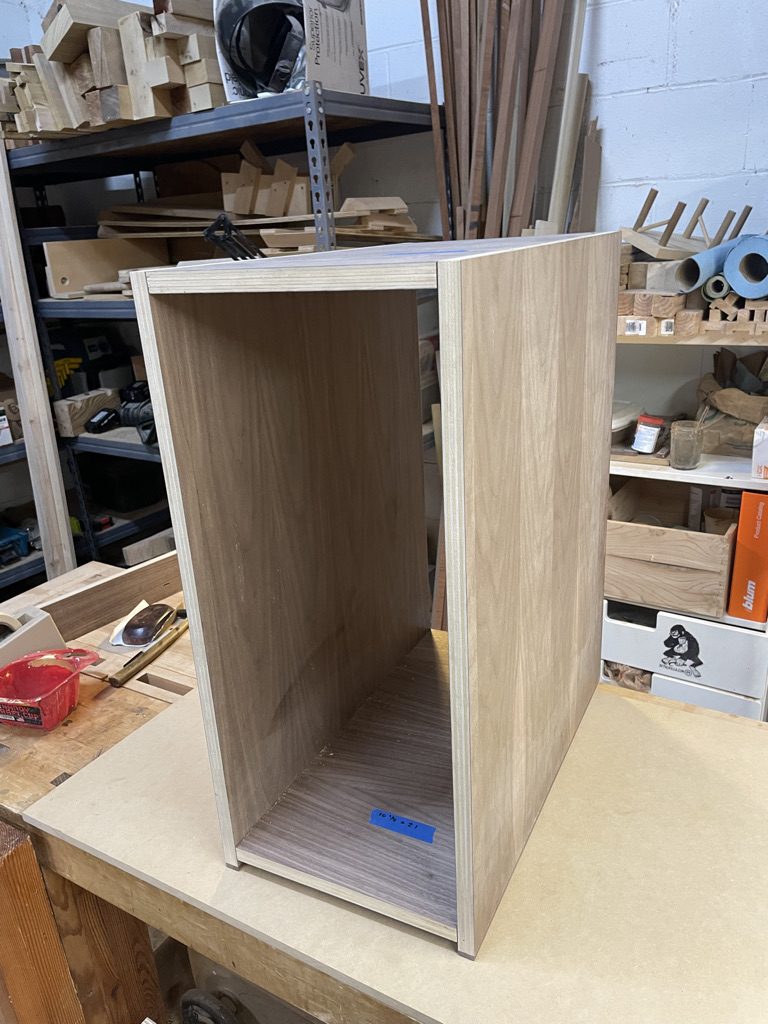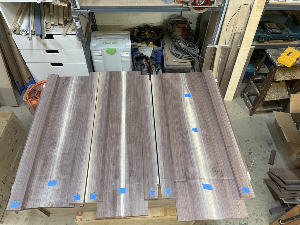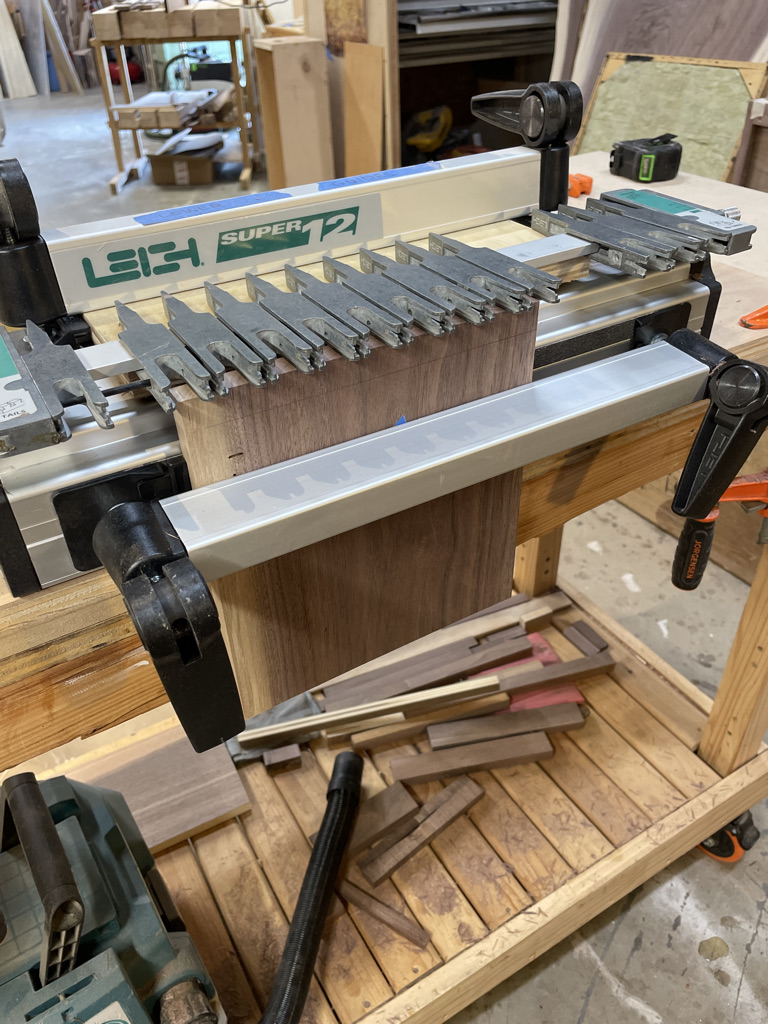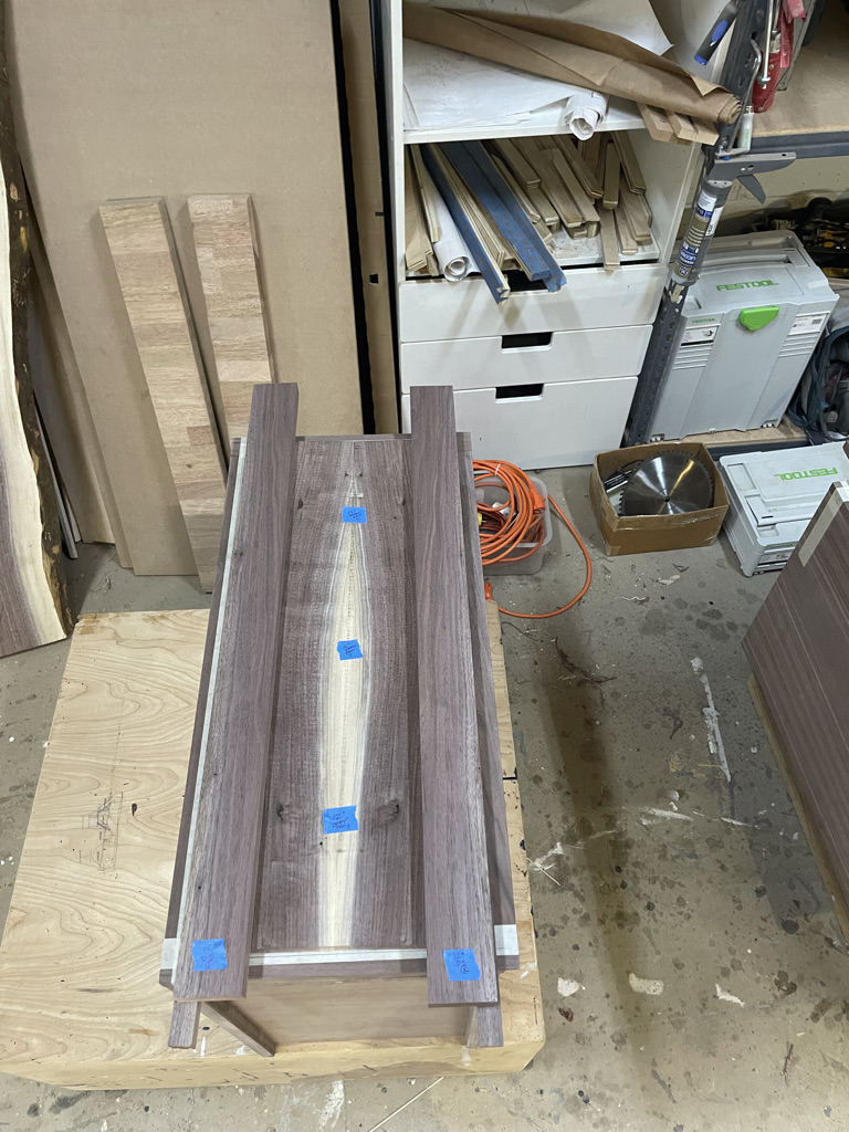 Navigating the unique challenges presented by the walnut slab, I decided to incorporate a waterfall edge on the open side of the desk. This solution effectively hid certain voids and inclusions in the wood while adding a striking visual element. During installation, we discovered that the two sliding trays didn’t leave enough room for his chair. I quickly redesigned one tray and made the necessary adjustment, ensuring that the desk met all of Larry’s needs and fit perfectly into his space.