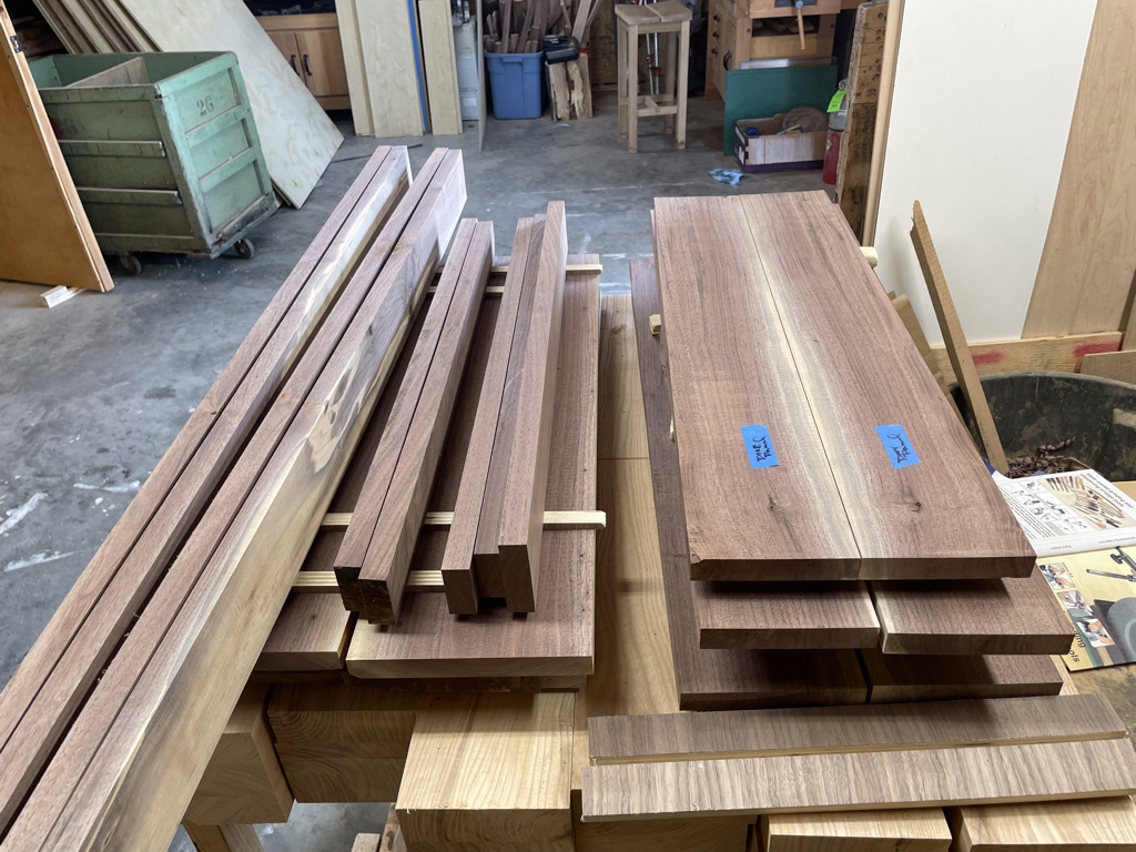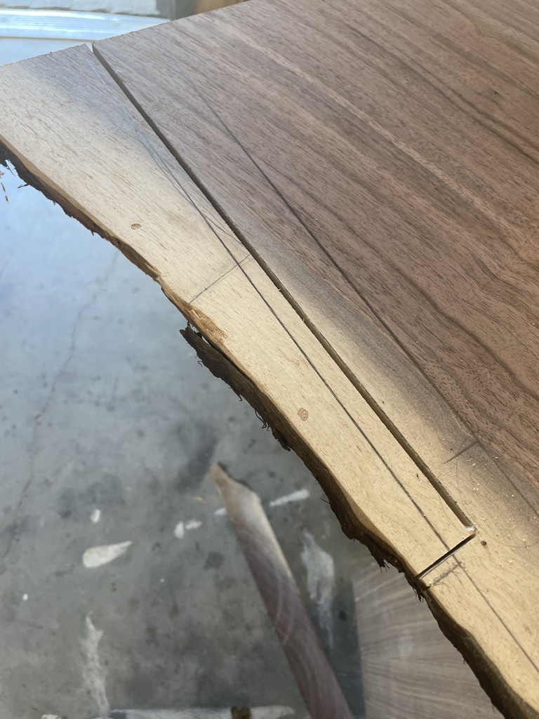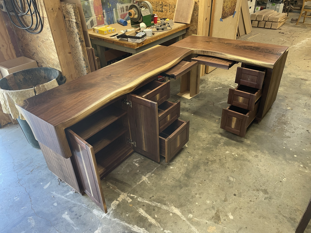 Larry Allgood, a local pilot from Burnesville, needed a desk for his home office that could fit into a tight space between a wall and his new fireplace hearth. He had purchased some walnut slabs that he loved and asked me to create a simple yet functional L-shaped desk. The design included two slide-out trays, allowing Larry to adjust his workspace to dodge the sunshine at different parts of the day.