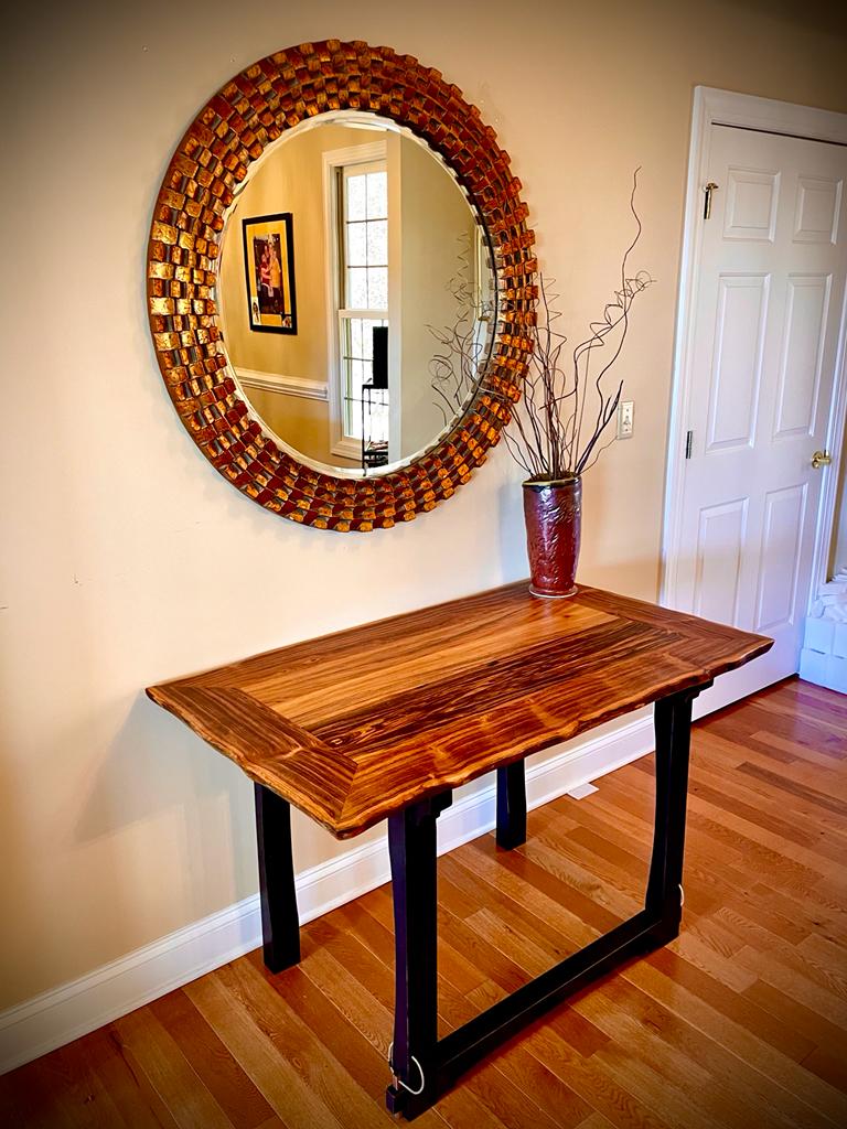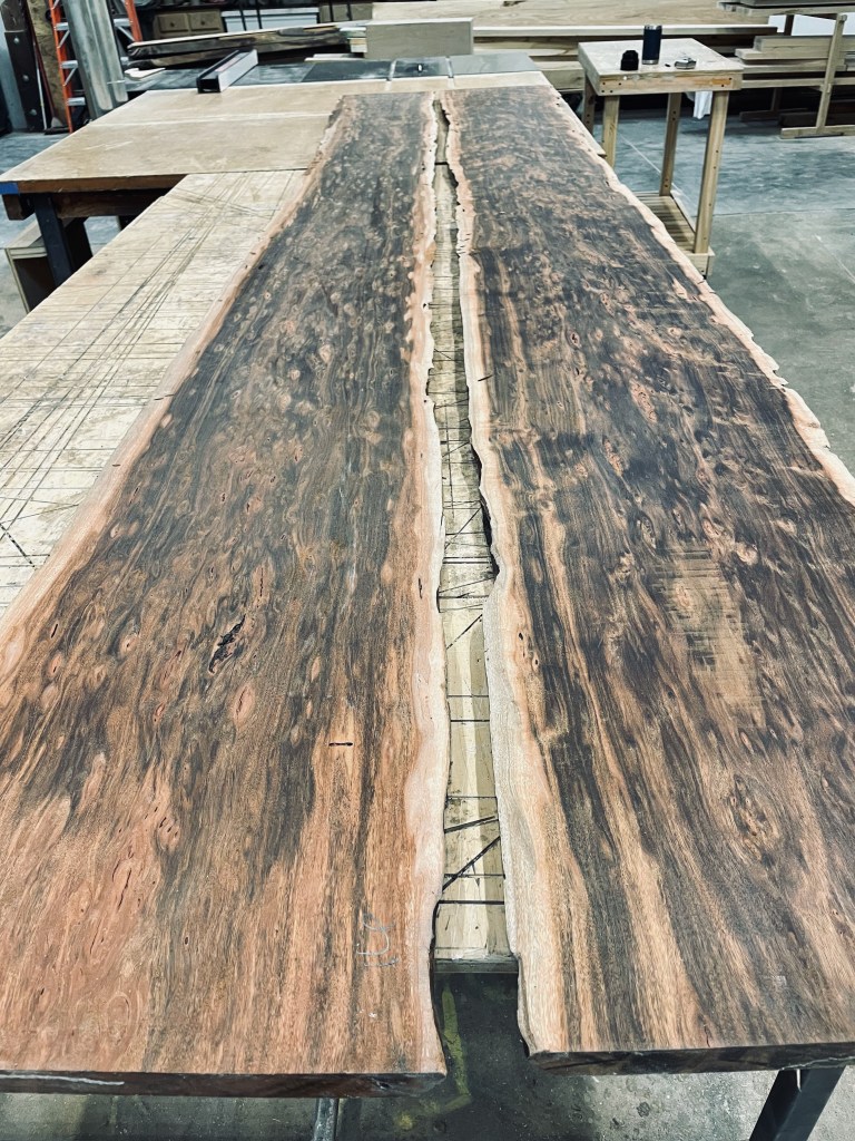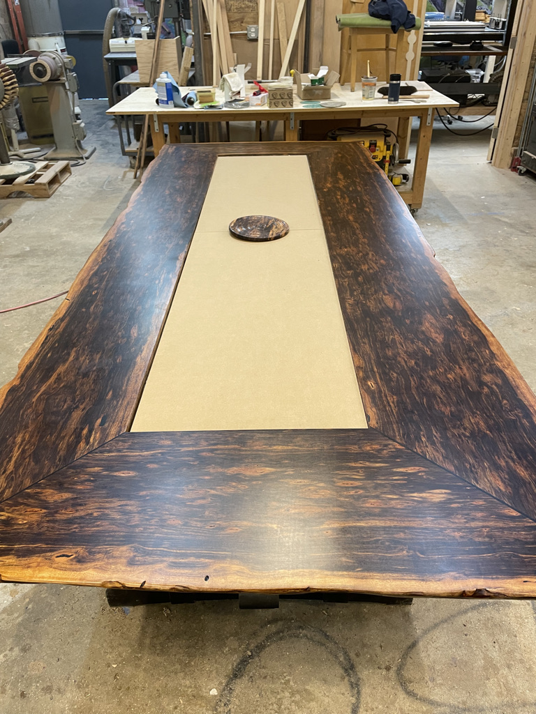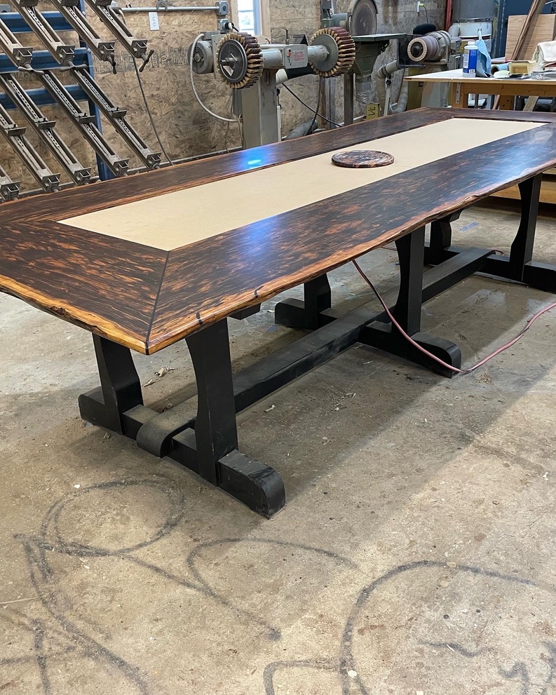 Originally, the table was to feature a tiled center and a live-edge design, an ambitious combination given the limitations of local sawmills and the difficulty of sourcing such large lumber. Fortunately, a local lumber yard specializing in exotic woods had a rare piece of Patagonian rosewood that was fourteen feet long and stunningly beautiful. This exceptional wood became the foundation of the table.